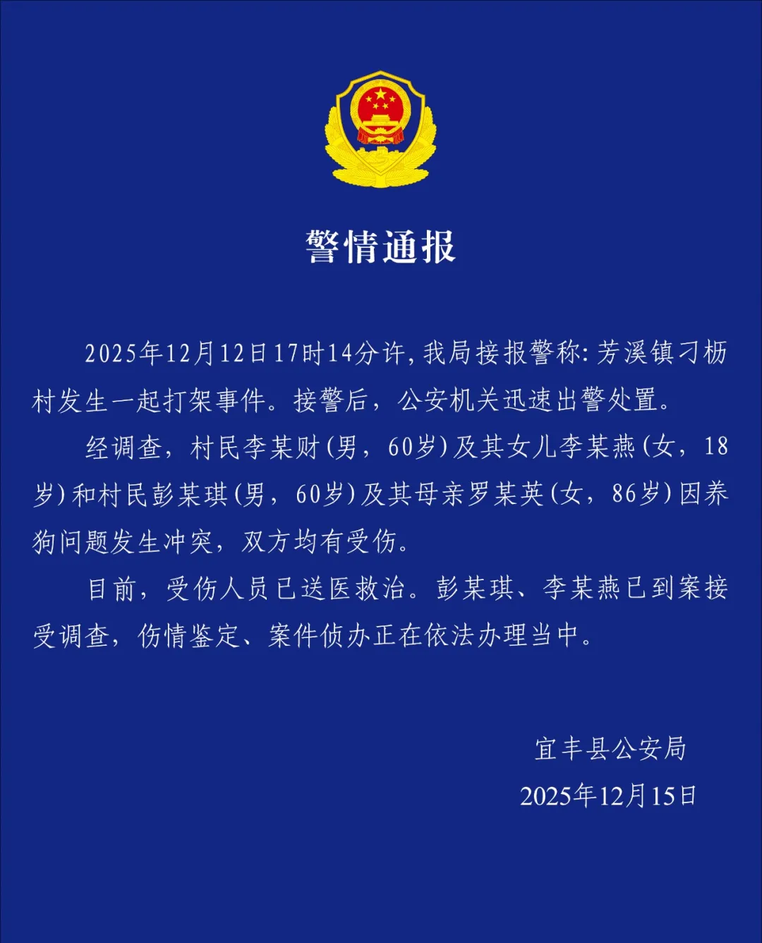 宜丰县公安局1215日晚发布警情通报。12121714分许,该局接报警称:芳溪镇刁枥村发生一起打架事件。接警后,公安机关迅速出警处置。经调查,村民李某财(男,60岁)及其女儿李某燕(女,18岁)和村民彭某琪(男,60岁)及其母亲罗某英(女,86岁)因养狗问题发生冲突,双方均有受伤。
